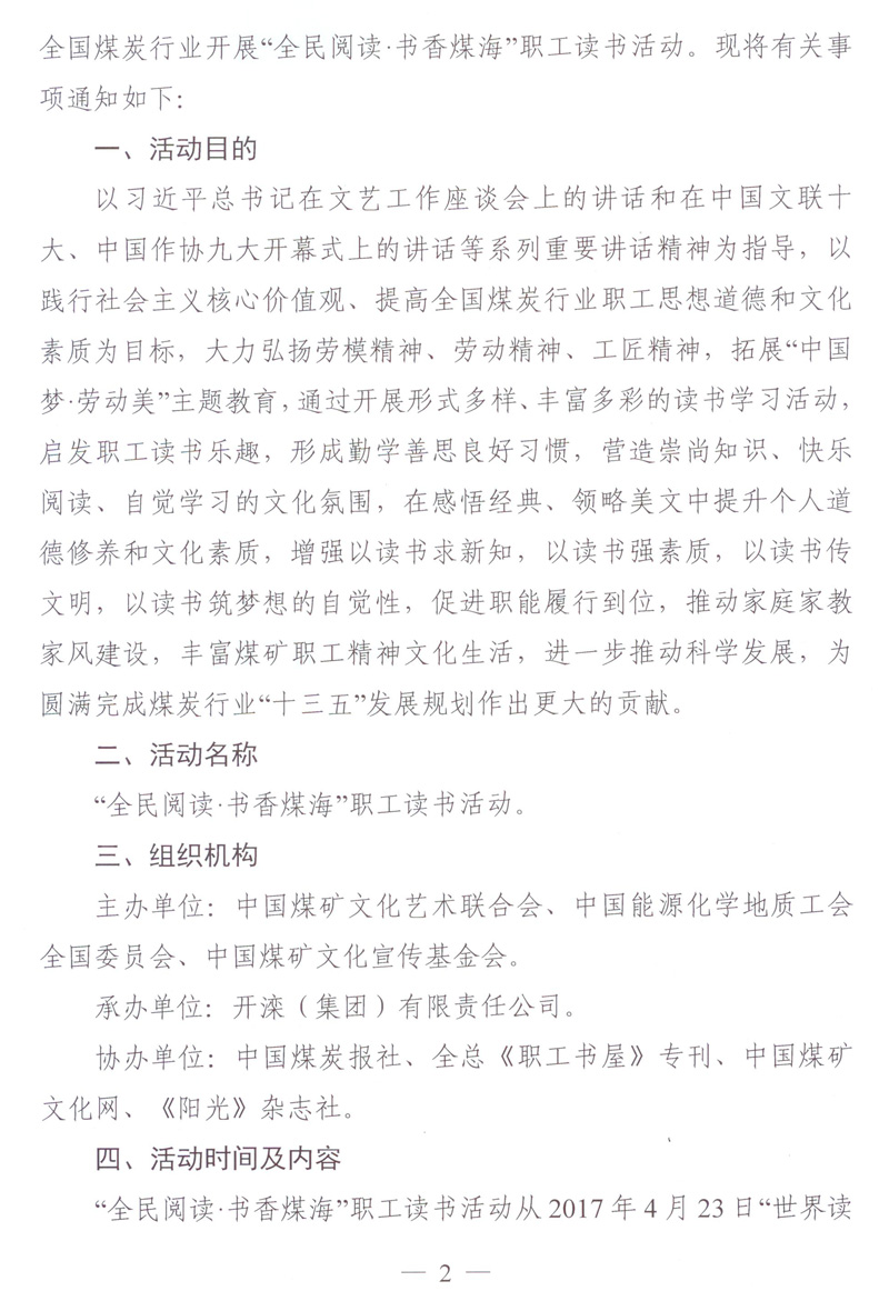 关于开展“全民阅读·书香煤海”职工读书活动的通知 来源:中国煤矿文联 作者: 时间:2017-04-21 【字体:小 大】 附件: 1. “全民阅读·书香煤海”职工诵读作品展播活动登记表 2. “书香企业”推选活动登记表 智能标签: 书香煤海 相关内容 分享到: 【打印正文】