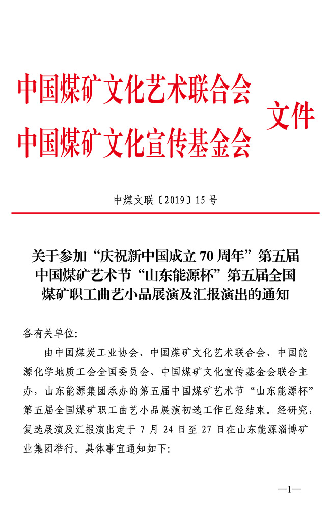 关于参加第五届全国煤矿职工曲艺小品展演及汇报演出的通知 来源:中国煤矿文联 作者: 时间:2019-07-10 【字体:小 大】 附件:• 关于参加“庆祝新中国成立70周年”第五届中国煤矿艺术节“山东能源杯”第五届全国煤矿职工曲艺小品展演及汇报演出的通知(PDF版,含附件1)• 参加展演人员回执表(附件2) 智能标签: 中国煤矿文联 相关内容 分享到: 【打印正文】