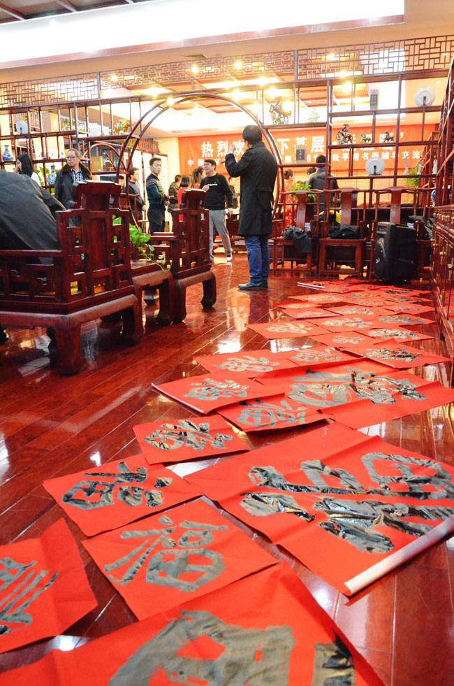 活动现场气氛热烈,艺术家们挥毫泼墨,为平朔矿区职工写“福”字、写春联,边创作书画作品边和平朔矿区的书画爱好者交流创作经验,笔会交流活动共书写“福”字200多个,春联60多套,创作书法作品50多件、美术作品10多件。艺术家们用饱蘸喜气墨汁的画笔创作出一件件饱含诚意的书画作品,为平朔矿区职工红红火火的生活送上美好的祝愿。
