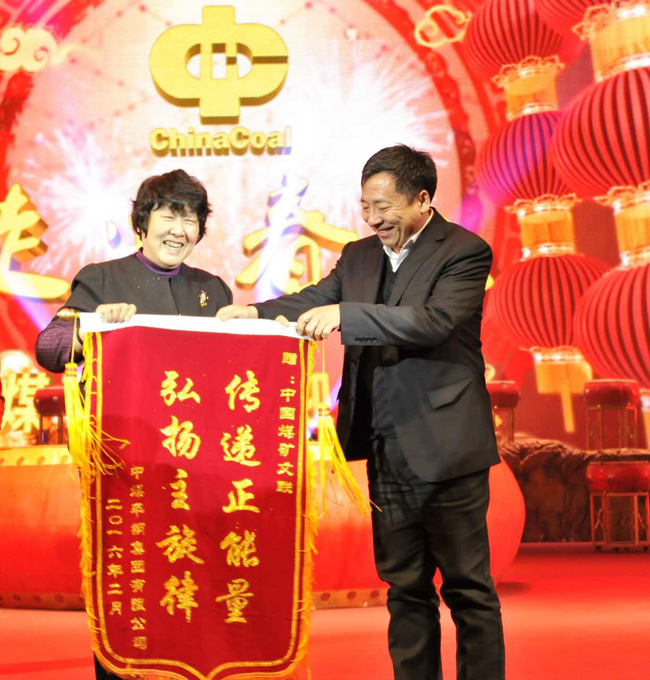 在演出开始前,刘勇代表中煤平朔集团公司向庞崇娅赠送了“传递正能量,弘扬主旋律”锦旗。刘俊代表中国煤矿文联作了讲话,并向平朔公司的全体职工及家属致以节日的问候。