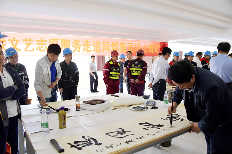 5月23日至24日,在第五个“中国文艺志愿者服务日”期间,中国煤矿文联组织文艺志愿者到山西大同煤矿集团开展了为期两天的文艺志愿服务活动。中国煤矿文联副秘书长、中国煤矿文联书协副主席兼秘书长盛军带队,中国煤矿文联宣传处副处长辛凡忠,中国煤矿文联书协副主席马铭、副秘书长杜占存、理事杨玉剑和中国煤矿文联美协副主席陶亚力参加了文艺志愿服务。期间,文艺志愿者和同煤集团党委常委、工会主席蒋煜,同煤集团文体发展中心主任、文艺志愿者协会主席杨占先等先后分别在塔山煤矿、晋华宫矿和同煤集团党校进行了书画篆刻作品赠送、创作交流笔会和书法艺术讲座等文艺志愿服务活动,受到了矿区职工群众的热烈欢迎。