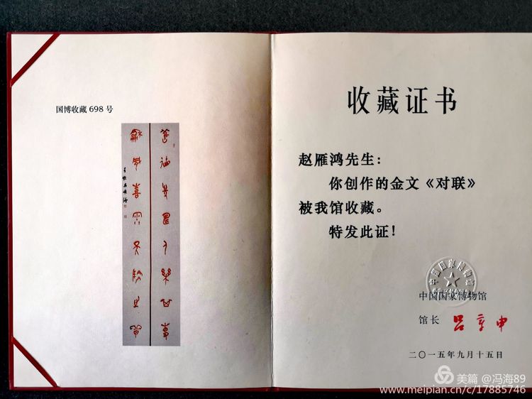 2014年,中国书协举办了一个专业大展,雁鸿的一副六尺对联成功入选并获奖,成为大同市建市以来获得中国书协专业展览大奖的第一人。2015年9月15日,国家博物馆收藏了当代十位书家的作品,并举行盛大仪式,前馆长吕章申代表国家博物馆为十位书法家颁发收藏证书,这其中,就有雁鸿的作品并且是唯一的一件大篆类作品入藏。众所周知,在此之前,国家博物馆只收藏1949年以前的并且是重大题材的作品,馆藏当代健在书法家的书法作品还是第一次。这件作品融甲骨、金文、简帛书等多种元素于一体,既拙朴浑厚、深沉苍劲,有古质之风;又清丽温婉、骨秀神清,具雅意之貌。可谓爽健之中寓苍厚,浑融之间透清朗。至此,雁鸿的书法作品和书法地位,有了一个完美的归宿,永久陈列于中华博物馆级的最高殿堂,进入中华艺术长河,载入中华历史的史册!