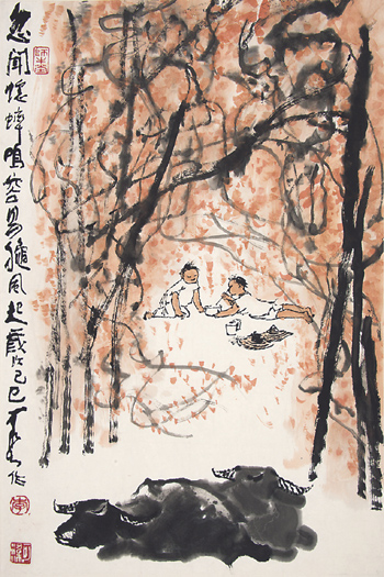 李可染画牛,开始于1942年,他在重庆水墨写生时。那时,为方便写生,李可染借住在一户农家,居住的房间临着农户家的牛厩,朝夕与水牛相望,他还经常同邻家儿童一起赶着水牛去放牧。水牛的勤劳、憨态引发了李可染的创作思考,而且他发现南方的水牛比北方的老黄牛骨骼体态富于变化,宜于用水墨画来表现,从此,充满童趣和纯真的牧牛和牧童成为李可染笔下的重要绘画题材。《浓荫浴牛图》中,牛卧于树荫下,儿童坐于牛背之上,好不惬意;《犟牛图》中,儿童使劲儿拉拽,牛却铆足劲儿驻足不前;《忽闻蟋蟀鸣》中,两头牛卧于树林旁,两儿童在树林里斗起了蟋蟀,各得其乐……李可染笔下的牛,无论是行、卧,或凫于水中,他都能把牛朴实无华的性格和充满泥土味的本色惟妙惟肖地刻画出来。李可染的牧牛图所表现的场景在乡村生活中随处可见,可一经他勾勒点染一番后,却别有洞天,境界顿时开阔起来,充分折射出李可染的一颗烂漫童心和对江南水乡的热爱。
