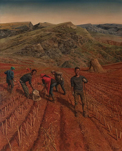 希望的田野上,总是洋溢着一餐一食带来的知足与欢愉,哪怕是在并不丰沃的土地上。油画《礼赞大地》是陈流“土地”主题系列作品之一,描绘了云南地区早春时节农民播种的景象。大面积的红土地,与绿色的群山形成鲜明对比,成为画面主体。几位农民或弯腰耕作,或持锄休憩。人物形象与环境融为一体,黄天厚土的浑厚凝重与天地人相谐的意蕴跃然纸上。该创作源于画家在云南红土地上的采风活动。采风的深刻体会,让久居城市的美术工作者对土地多了一份敬畏,更升华了对土地的认识。