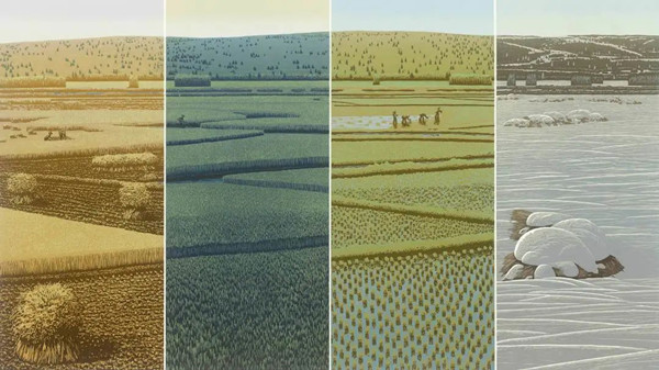 黑土地被誉为“耕地中的大熊猫”。东北地处世界三大黑土带之一,作为我国重要商品粮基地,肩负着维护国家粮食安全的重任。宋洪宇的版画《黑土稻香》,以四条屏的形式,用固定视角串联起黑土地上稻田的四季景色:秋之金黄、夏之绚烂、春之萌动、冬之静穆。三两人影点缀在个别画幅中,平添生机与活力。细腻的线条、浪漫的色彩,尽显“寒来暑往勤耕耘、稻谷飘香喜丰收”的景致,可谓美不胜收。四种不同的色调,凸显四季更替的节奏感,强化了时间的流动与空间的张力,彰显东北大地的辽阔。