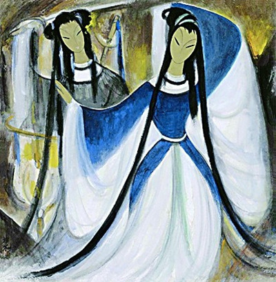 林风眠在研究中国传统艺术的同时,也长期关注着西方现代艺术。在创作实践中,他试图提炼东西方艺术的语言要素,寻找两者的共通之处,并进行融合。热爱戏曲的他,一生中创作了大量浓墨重彩的戏曲人物,其中多幅作品的构图和人物形象较为相似。画家以平面化的造型语言描绘人物和服饰,力求概括对象,强调线条的流畅和表现力,但每幅作品又在线条走向、形体结构、造型特征等要素的处理方式上各有侧重,呈现出微妙的差异。对比他以中国画和油画两种艺术语言创作的《白蛇传》便可见一斑。