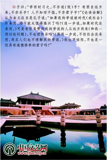 ◎子曰:“学而时习之,不亦说(悦)乎?有朋自远方来,不亦乐乎?人不知而不愠,不亦君子乎?”《论语诠解》认为本义应当是孔子说:“如果我的学说被时代(或社会)所采用,那不就太值得高兴了吗?(退一步说,如果时代没采用,)可是有很多赞同我的学说的人从远方而来(和我一同讨论问题),不也很快乐吗?(再退一步说,不但社会没采用,而且人们也不理解我的学说,)我也不恼怒,不也是一位具有道德修养的君子吗?”