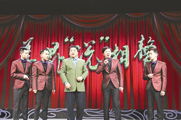 2月6日,姜昆从艺40周年个人相声专场“姜昆‘说’相声”在北京举行。图为姜昆在专场演出上与80后、90后说相声