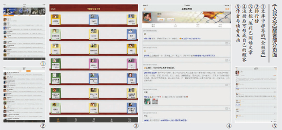 《人民文学》醒客部分页面:①文库中推荐的“金短篇”  ②排行榜  ③文柜,陈列已阅读文章  ④注册后可形成自己的醒客  ⑤作者与读者互动