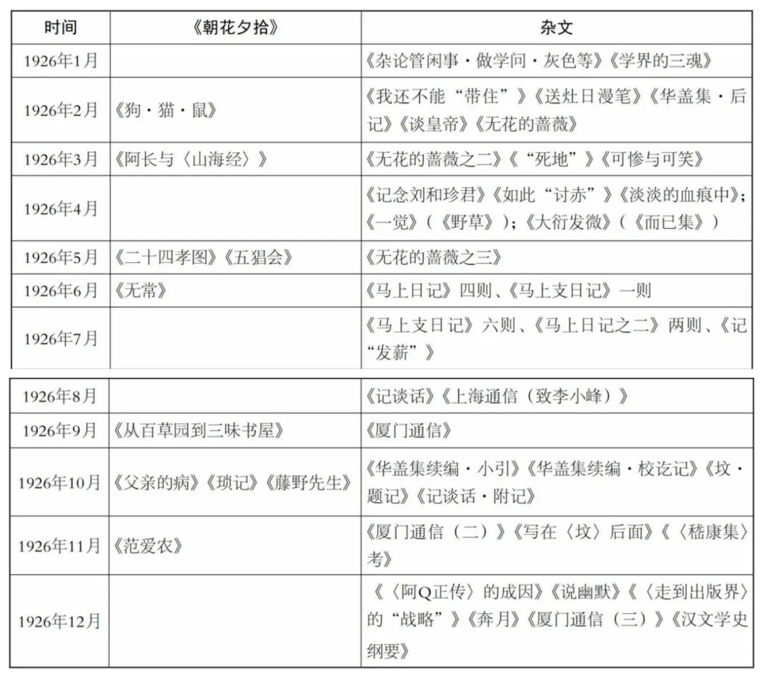 不妨把贯穿1926年全年的这两个相互交织的系列篇目略加筛选,再按月罗列,以表格形式做一对比: