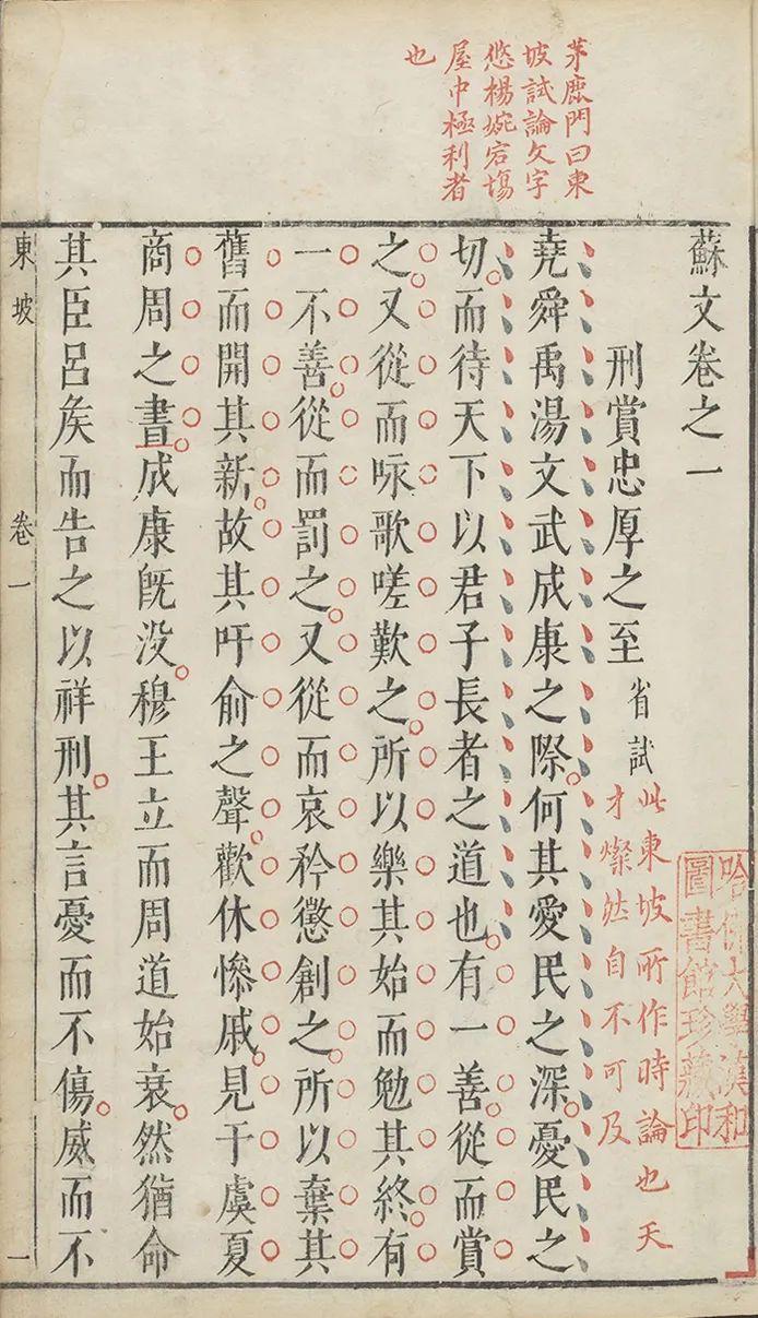 茅坤、钱丰寰二人圈点是以双色区分的,这样虽然一目了然,但有时也会出现二家圈点重合或错落的情况。先看圈点的重合。如《苏文》卷一所选《刑赏忠厚之至》一文,篇首“尧、舜、禹、汤、文、武、成、康之际,何其爱民之深,忧民之切,而待天下以君子长者之道也”数句字旁,既有茅坤标示“文之佳处”的黛色小点,也有钱丰寰标示“佳处”的朱色小点,二家意见一致,这对读者而言是一种视觉上的提醒,强调阅读时应格外留心。由于二家圈点法并不完全相同,有时在文中也能起到互补的作用。从符号类型上来说,茅坤圈点法仅抹、圆圈、尖圈、旁点四类,而无标示段落的截,因此文中的分段符号皆出自钱丰寰之朱色圈点。如《刑赏忠厚之至》一文中,有“见于虞、夏、商、周之书”下、“呜呼,尽之矣”下、“故曰忠厚之至也”下三处标示段落的朱色“|”,补充了茅坤圈点法在分段上的不足。另外如《孔子从先进》《既醉备五福》《大臣论上》《大臣论下》诸论,并无茅坤的黛色圈点,仅有唐顺之、茅坤评语,因此钱丰寰的朱色圈点在阅读效果上也构成对二人评语的呼应或补充。总的来说,如前引叶德辉《书林清话》“刻书有圈点之始”一条所言:“至于《史汉评林》,竟成史书善本;归评《史记》,遂为古文正宗。习俗移人,贤者不免。因是愈推愈密,愈刻愈精。有朱墨套印焉,有三色套印焉,有四色套印焉,有五色套印焉,至是而椠刻之能事毕矣。”26像闵尔容所刻《苏文》这类运用套印技术来汇合不同圈点,与“评林”“汇评”本的流行,都反映出晚明书籍印刷和出版业的发展,对文章圈点之风的盛行起到了推波助澜的作用。