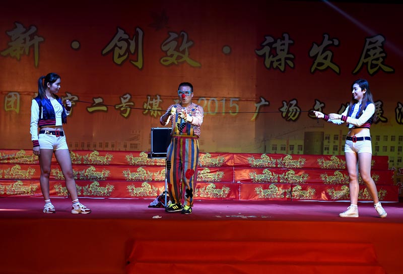 广场文化演出在广场舞《快乐歌谣》的动感旋律中拉开帷幕。整场演出由歌曲、舞蹈、健身操、快板、戏曲、大合唱等16个节目组成。表演者以娴熟的舞蹈、悦耳的歌唱、青春活力的现代舞、动感十足的健身操、美妙的器乐合奏、惟妙惟肖的戏剧表演、柔缓的太极剑表演等喜闻乐见的节目表演,令现场观众目不暇接,不时报以热烈的掌声。特别是歌曲《矿工光荣》,一线矿工们充满激情地歌唱劳动,歌唱创造,颂扬爱岗敬业、默默奉献的煤矿人;矿合唱团用美妙的旋律重温抗战悲壮的历史,用昂扬的歌声描绘共筑中国梦、兖矿梦、济二梦的豪情壮志。整场演出节目精彩纷呈,充分展示了全矿干部职工蓬勃向上、实现梦想的良好精神风貌。