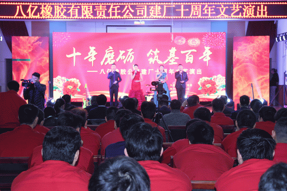 十年艰辛探索,十年春华秋实,十年创新辉煌!11月14日下午,八亿橡胶公司活动中心流光溢彩,歌声阵阵,舞姿翩翩,现场一派欢乐气氛,庆祝八亿橡胶公司成立十周年文艺演出正在这里隆重举行。