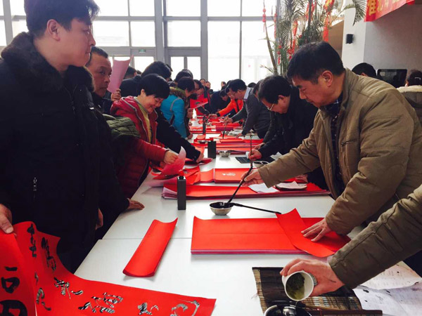 在最后一站,为集团公司机关职工书写春联活动中,淮北矿业集团工会主席、中国煤矿文联副主席、中国煤矿书法家协会主席张宇亲自上阵,为职工挥毫泼墨书写春联。淮北矿业集团总经理方良才、副总经理孙方亲临现场,对参与创作的书法家进行慰问,并祝矿区职工家属新春愉快、猴年吉祥。