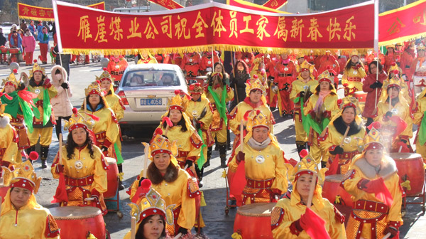 “咚咚嚓、咚咚嚓”,正月初八上午九点多,在同煤集团雁崖煤业公司的调度楼前,铿锵有力的秧歌锣鼓点儿,把区队的员工和居住在雁东街、雁南街和二分会的员工家属们,都吸引出来了,他们三三两两的结伴来公司调度楼前的小广场上,来观看今年春节长假后第一场秧歌表演。