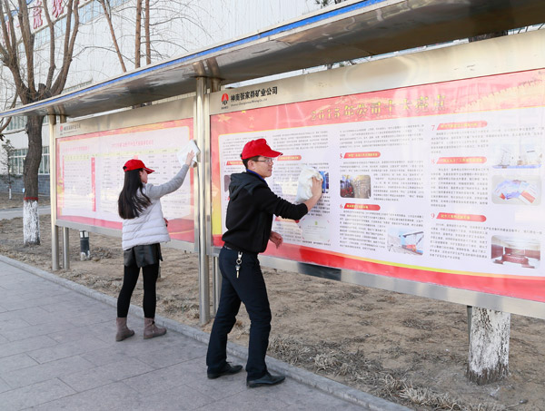 为了改善矿区环境卫生面貌,上午11时,鲜艳的团旗,靓丽的青年志愿者共30余人活跃在公司工业厂区。对公司厂区、生活区的各类牌版进行了清洗,使各个区域的牌版亮丽如新亭亭矗立着。