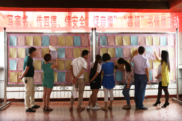 告别了喧闹与炎热,步入同煤集团宏远公司一楼大厅,瞬间感觉到清爽与温馨。原来这里正在举办“写家书、传四德、保安全、促亲情”“四德”家书展。“亲爱的爸妈,您们辛苦了!”、“我最敬爱的老师,您现在好吗?”、“兄弟,牢记规章,注意安全!”、“宝贝,要永远健康快乐哟。”……一封封动情至深的家书不禁让人驻足,有交流感受的,有深情诵读的,有认真翻阅的,不大的展厅很是热闹。