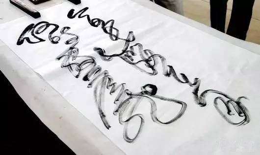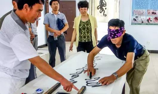 淮北市段园镇牛眠新村文化楼里,煤矿退休工人黄化举蒙眼用手指头作画,引观看者拍照称绝。黄化举在砚盘上蘸墨,然后灵活地利用指尖、指头、指侧、点、勾、挑、划、擦、染一气呵成,很快,一幅独特韵味的书法展现在观众面前。