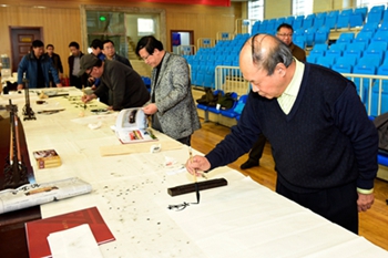 此次活动共邀请省、市以及潞安集团的20余名书画家参加,其中有享誉省内外的著名作家、书法家王东满先生,篆刻家、书法家、画家方胜先生,长治市美协主席孟多昕,长治市书协主席程旭清,长治市青年书协主席史留俊等。上午9点整,展览正式拉开序幕,书画家们首先参观了展览。本次展览作品题材丰富、形式多样,从整体作品上看,行草隶篆皆有,国画作品山水、花鸟俱全。只见正楷方正规矩,篆书刚劲有力,行书飘逸清秀,草书有万马奔腾;美术作品山水大气磅礴,荷花水墨清香飘逸,写意画中寓含深意。整个展厅真可谓书香飘远,翰墨传情。再看摄影作品,有建矿历史照片,十年辉煌成就图片,也有摄影家走进矿区采风所拍摄的优秀作品。展览照片完美的构图、饱满的色彩,如身临其境。在笔会现场,随着王东满先生的一幅“惠风和畅”落墨,众书画家正式开始了现场笔会。只见他们臂运千金,笔走龙蛇,行书、楷书、草书、隶书、山水画各显其能,一幅幅苍劲有力的作品展现在眼前,引得大家啧啧称赞。此时,工作人员有的准备纸张,有的挑选内容,有的扶墨拉纸,有的整理成品,各行其事,规范有序。经过一上午切磋交流,书画家们畅舒心怀,各表其意,书写司马煤业公司十年发展成就,讴歌矿工奉献精神,为该公司成立十周年纪念活动锦上添彩。