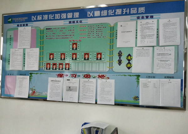 班组管理看板在前期设计准备、制作过程中部门管理人员就广泛发动员工积极参与,后经过大家的共同努力,管理看板最终定型,它凝结了部门管理人员和参与员工的心血和智慧。看板以蓝绿作为主色调,美观大方,具有较强的视觉冲击力,一经悬挂上墙展示便成为每个班组中最吸引眼球的亮点。