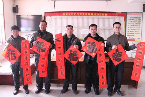 该矿工会提早谋划,事先采购好大红纸、墨汁、金粉和毛笔等物品,组织书法协会人员在该矿会议室为一线职工义务书写春联。