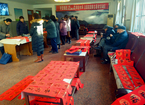 参加活动的老年书画研究会十名成员在秘书长薄惠明的带领下挥毫泼墨,送春联、赠祝福,送去了集团公司对老同志们的亲切关怀!送去了对老同志们的新春祝福!本次活动得到了离退休老同志的热烈欢迎!收到了预期的效果,有200余名离退休老同志到场参加了本次活动,现场赠送春联和福字200幅。老同志们一致表示:非常感谢集团公司领导的关怀和祝福,感谢老书画家们为我们书写出积极向上的老年文化作品。同时,通过老年书画研究会这个平台,沟通了老书画家与广大离退休职工进行文化交流的渠道,调动了离退休老同志参与文化养老的积极性。