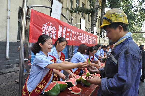 这是7月11日上午9时许,河南能源集团鹤煤公司三矿工会在更衣楼前为职工“送清凉嘱安全”分发西瓜的感人场景。