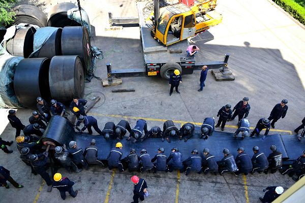 东峡煤矿主提升改造工程主要包括驱动机房配电室改造、主井筒扩帮、主井胶带机改造、暗主井胶带机驱动部改造、电控系统改造五部分,这项工程是该矿安全生产建设的重点工程项目,改造计划工期为56天,为了尽快完成主井系统改造工程任务,最大限度的减少影响生产的时间,该矿成立主提升系统改造工程指挥领导小组,矿长,书记为组长,下设拆除安装组、技术负责组、综合协调组、硫化接头组,从6月9日工程开工那天起,每个工程小组领导的窗前,都点燃了一夜夜不灭的灯火,夜空下的灯影空寂而热烈,会议室的烟雾袅袅中加重,施工方案的论证继续进行……经过充分酝酿、集思广义,最终采用绞车牵引,一次连续敷设的更换方案。烈日下,在回撤旧胶带现场,30多名职工手拉胶带,步步前移,回收上来的旧胶带迅速被几名职工截割成100多米,然后盘起来用钢劲帮扎,最后在响亮的的呐喊声中装上了车。