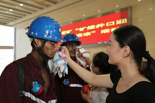 7月13日,炎炎夏日,中煤集团大屯煤电公司徐庄煤矿工会家属协管会组织十名矿嫂到井口候罐大厅,开展“矿嫂井口迎亲人、送清凉”活动。 矿嫂们用一个深情的拥抱、一句句朴实的话语温暖着丈夫的心,她们为自己的丈夫擦拭脸上的汗水和污渍,送上西瓜、雪糕、水放在丈夫的手中。矿嫂张楚说:“结婚这么多年,这是第一次亲眼看到老公上井后的模样,熟悉又陌生,更多的是心疼!”矿嫂们纷纷表示一定叮嘱他们时刻牢记安全,自己照顾好家、照顾好老人孩子,不让丈夫操心,让他安心工作!孔部长希望大家把这瞬间的感动长久地记在心间,对丈夫多体贴、照顾,让丈夫开开心心工作,多为矿安全生产做贡献!