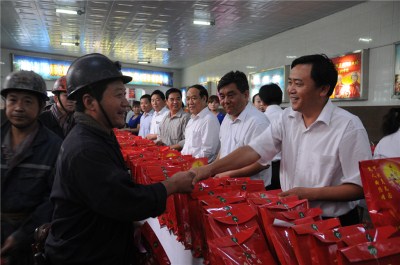 河南煤化焦煤集团党委书记于顺德(右一)在井口慰问一线员工