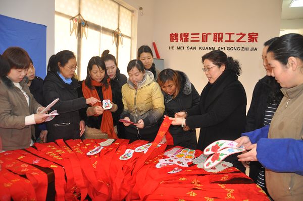 这是3月1日下午,河南能源集团鹤煤三矿协管员在工会二楼会议室观看“巧手促安全”绣品展活动现场的热闹场景,从这些绣品中折射出协管员的心灵手巧。