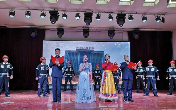 演出在激情洋溢的开场舞《盛世欢歌》中正式亮相,优美的舞姿,将十九大以来义海能源取得的伟大成就一一演绎。随后,歌曲《在希望的田野上》、《我大家乡大平原》讴歌了中原儿女扎根青藏高原的无私奉献精神;情景剧《好久没回家》深情的演绎,让在座的干部热泪盈眶,触动了那根他们思念家乡和亲人最脆弱的神经;诗朗诵《2018,义海这一年》以波澜壮阔的史诗全面回顾总结了义海能源2018年取得一个个非凡成就;小品《一家人》弘扬了民族团结一家亲的时代主旋律。戏曲串烧、歌伴舞、蒙古舞等节目将现场氛围引向高潮。