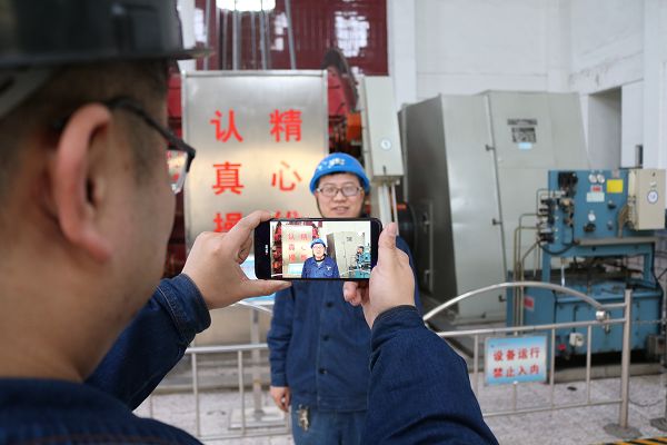图为该公司春节坚守岗位职工王蒙在工友帮助下为父母拍摄新年祝福视频。