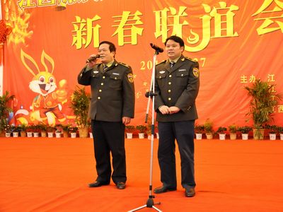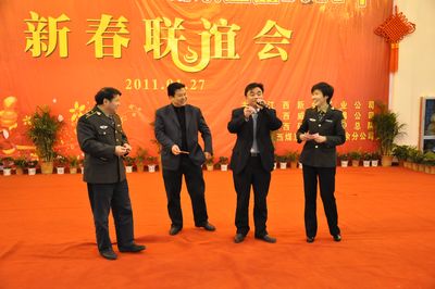 四家单位的领导对联谊活动的开展十分关心,他们饶有兴趣走上舞台为大家送来欢乐。救护总队领导廖水平和张党生共同登台演唱了《小白杨》,唱出了边关军人的威武雄壮,新余矿业罗庆贺总经理与金定秀合作演唱了《为了谁》、《兵哥哥》。罗庆贺总经理和康峰书记共同演唱《北国之春》将新春联谊会气氛推向高潮,他们用雄浑高亢的音韵祝福新余矿业公司、矿山救护总队、威源公司和省销运公司新余分公司的明天会更好。