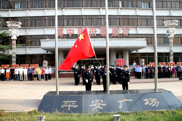 8点30分,“升国旗、唱国歌”仪式正式开始。由该矿保卫科组成的国旗护卫队,迈着整齐矫健的步伐,护卫着国旗走到升旗台前,全体人员向国旗行注目礼,全员齐声高唱《义勇军进行曲》。在雄壮的国歌声中,鲜艳的五星红旗冉冉升起,迎风飘扬在矿区的上空。