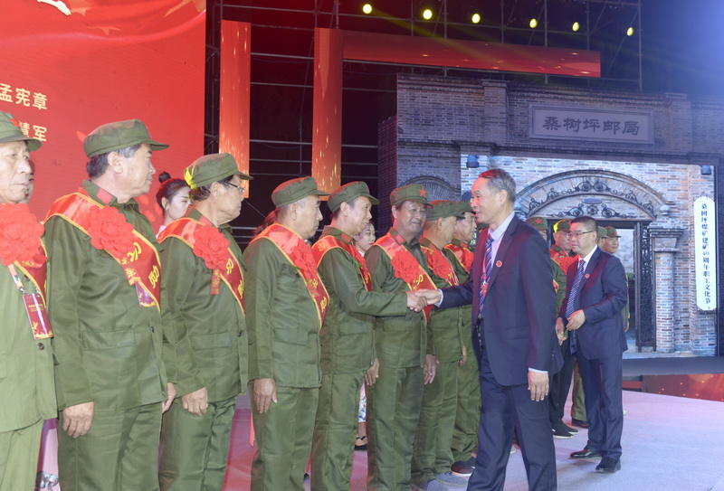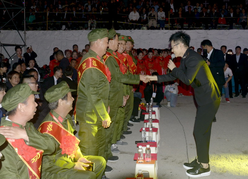 晚会第一篇章的一首《基建兵之歌》,将大家的思绪带到团结起来,自力更生,艰苦创业的那个激情燃烧的岁月里。在现场观众的热烈掌声中,这次庆祝活动,特邀的原中国人民解放军第42支队官兵——20世纪70年代,曾经参加过桑树坪矿基本建设的孟凡昌等14名基建工程兵代表,身着戎装,列队健步走到舞台中央,接受矿区职工家属对煤矿建设先驱者的致敬。韩城矿业公司党委书记、董事长陈永民、总经理屈永安为他们披上桑树坪矿“功勋建设者”绶带,并颁发了荣誉证书。