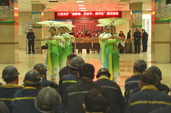 为丰富职工业务文化生活,在新春佳节来临之际给广大职工送去新春的祝福,1月6日,中煤新集公司文工团带着精心编排的文艺节目来到口孜东矿进行新春慰问演出,为矿工兄弟们送去一份节日的祝福。图为公司文工团正在演出舞蹈“为矿工撑起安全之伞”。