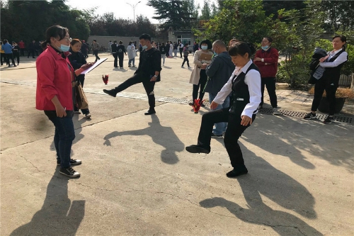 “比赛赛距20米,参赛人员按顺序纵队依次排列,并用眼罩蒙好眼睛,参赛人员持敲锣棒,当听到发令号后,在起点处顺时针转3圈,向前行走10米再逆时针转2圈,再进行敲锣,敲中即赢。”10月3日上午9:00,听武装保卫中心车间工会主席白亭介绍完游戏规则,大家便迫不及待地寻找最佳位置准备一展身手。一贯紧张严肃的武装保卫中心院内热闹异常。