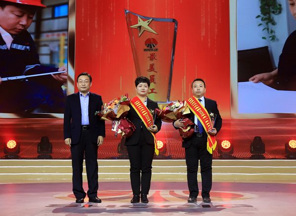 陕煤集团公司党委委员、工会主席李向东为最美员工王治英、刘君义颁奖并合影