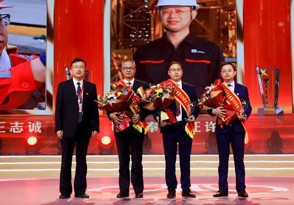 榆北煤业公司党委书记、董事长肖绪才为最美员工王志诚、汪许林、王宏宇颁奖并合影