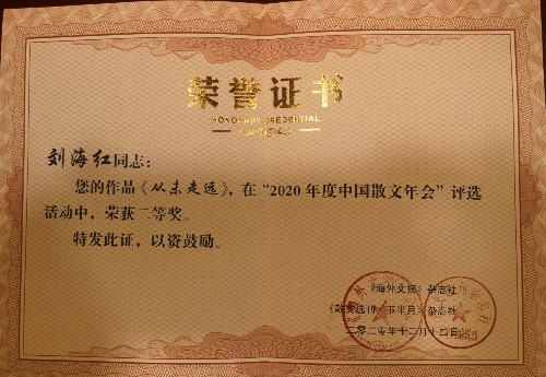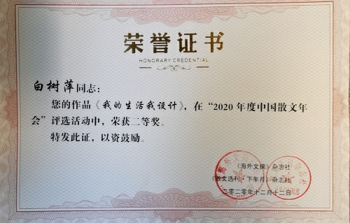 近日,由《海外文摘》杂志社、《散文选刊·下半月》杂志社主办的2020年度中国散文年会及颁奖大会在北京召开。汾西矿业职工白树萍的散文《我的生活我设计》和刘海红的《从未走远》荣获散文类单篇作品二等奖。