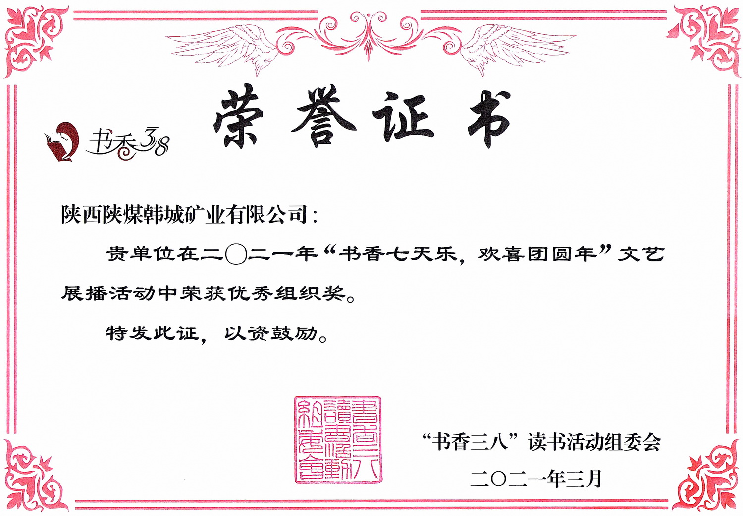 近日,从全国“书香三八”读书活动组委会传来喜讯:陕煤集团韩城矿业公司在“书香七天乐 欢喜团圆年”文艺展播活动中荣获优秀组织奖,创新产业发展公司杨静家庭表演的《家庭音乐会》荣获优秀表演奖。