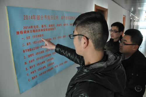 图为该矿职工在观看张贴的2014年部分节假日安排表。