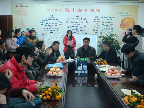 在元旦来临前,该矿环保中心、更新厂、洗煤厂女工协管分会,深入协管结对子单位生产准备队、综掘一区,综掘二区,开展结对子联谊活动并搞好后勤服务。她们利用该区班前会时间,为一线职工送上平安果、吉祥橘,宣读《安全慰问信》,为一线职工献上《好人一生平安》《365个祝福》等歌曲,在欢声笑语中营造出浓厚的亲情嘱安全舆论氛围。图为环保中心女工为生产准备队矿工师傅演唱祝福歌曲。