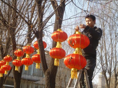 1月17日,山东能源淄矿集团亭南煤业公司总务科工作人员正在将400多个灯笼挂上灯杆,一串串火红的灯笼营造出浓浓的新年氛围。