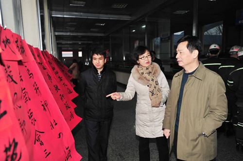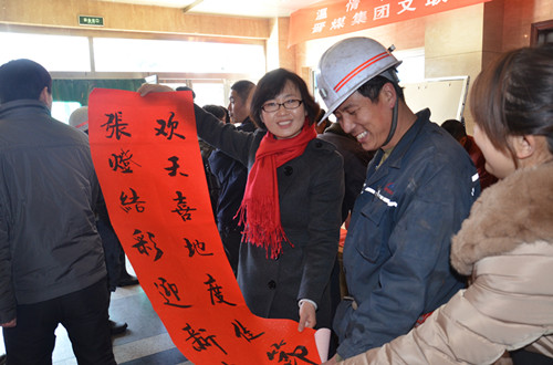 大红纸、黑墨汁,摆起桌子,挂起春联。凤凰山矿的安全文化长廊里,喜气洋洋,非常热闹。集团公司工会副主席董清、文联负责人带着集团工会领导的关心和祝福来到现场,把500余幅春联递到出井职工手中,拉开了写春联送矿工,送祝福进矿山活动大幕。一位夜班升井的老矿工黝黑的脸上露出喜悦的笑容,捧起墨迹未干的春联忘记了疲惫,爱不释手啧啧称赞:往年都是自己花钱去买春联,今天的活动,既给我们增添了春节的喜庆气氛,同时也亲眼看到了矿山书法家行云流水的书写过程,真长见识。凤矿工会主席也在现场为职工写起春联,亲自把新年祝福送到职工们心中。