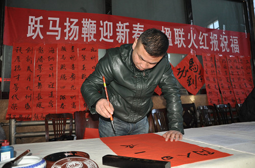 文联为丰富矿区文化建设,特别重视,提早筹备,聘请书协精英骨干,利用业余时间写春联,书写内容紧扣喜迎新春和党的十八届三中全会主题,思想鲜明,内容积极、健康向上,精心创作了3500多副对联。六大矿领导和工会也非常重视此次活动,前期也做了充分的筹备工作,组织人员,书写了5000余副对联,全力配合,鼎力支持此次活动,现场组织各具特色。通过一周的时间,文联组织的20名曾在全国以及省内外多次获奖的矿山书法家在井口、班中餐食堂、交接班楼、澡堂门口现场书写楹联5000余幅。每到一处,请矿山书法家写春联的人络绎不绝,赢得了一线职工和家属连连称赞。不仅让人们感受到了年节的欢乐,同时也让基层职工家属在寒冷的冬天感受到企业大家庭的温暖。