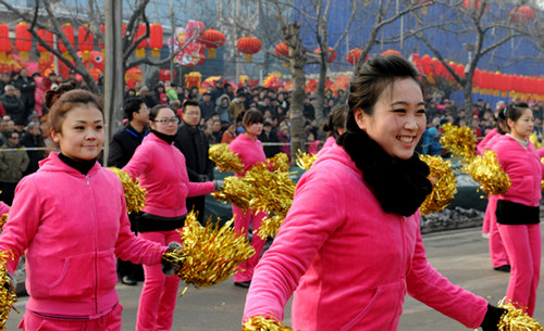 红绸彩扇,交相辉映;锣鼓唢呐,此起彼伏;一条条长龙,口喷火焰;一头头彩狮,欢腾跳跃;还有那旱船、跑驴、秧歌,各种传统民间文艺节目一一呈现,加上时尚的健美操表演和威风凛凛的武术表演,无论是表演者,还是观看者,人们喜上眉梢,乐在其中。