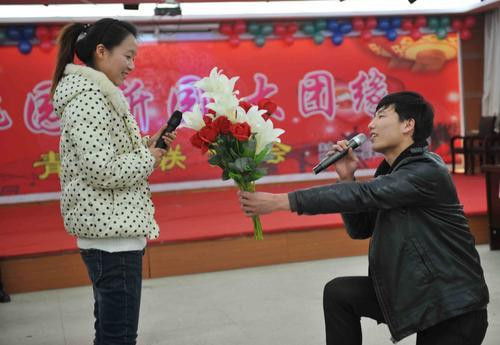 我关注你已经很久了,愿意嫁给我吗?请接受我,嫁给我吧!淮北矿业桃园煤矿保运一区青工王丽斌手捧鲜花、单膝跪下,在近百人的注视下向面前的女孩大声地表白,现场立即响起一阵急促、热烈的掌声。