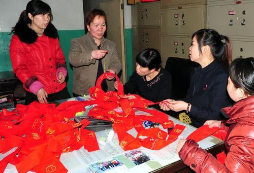 河南能源化工集团鹤煤三矿女工委组织安全协管员,义务开展为井下员工制作安全绣品活动,她们带着深厚的感情和对井下工的关爱,一针针、一线线绣制围巾、鞋垫、红腰带等,送到井下员工手中,让他们记住大伙的安全嘱托。图为3月11日,该矿女工委组织安全协管员为员工绣制红腰带。
